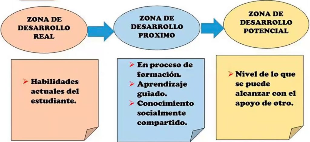 Vygotsky denomina Zona de Desarrollo próximo a la tensión que se produce entre el desarrollo actual del niño/joven y al desarrollo potencial que puede alcanzar con la ayuda de agentes de desarrollo que brindan apoyo y orientación. El nuevo desarrollo alcanzado donde dicho apoyo y orientación ya no serán necesarios, pasará a ser el nuevo desarrollo actual permitiendo plantear un nuevo desarrollo potencial donde nuevamente el apoyo y la orientación ocuparán su lugar.